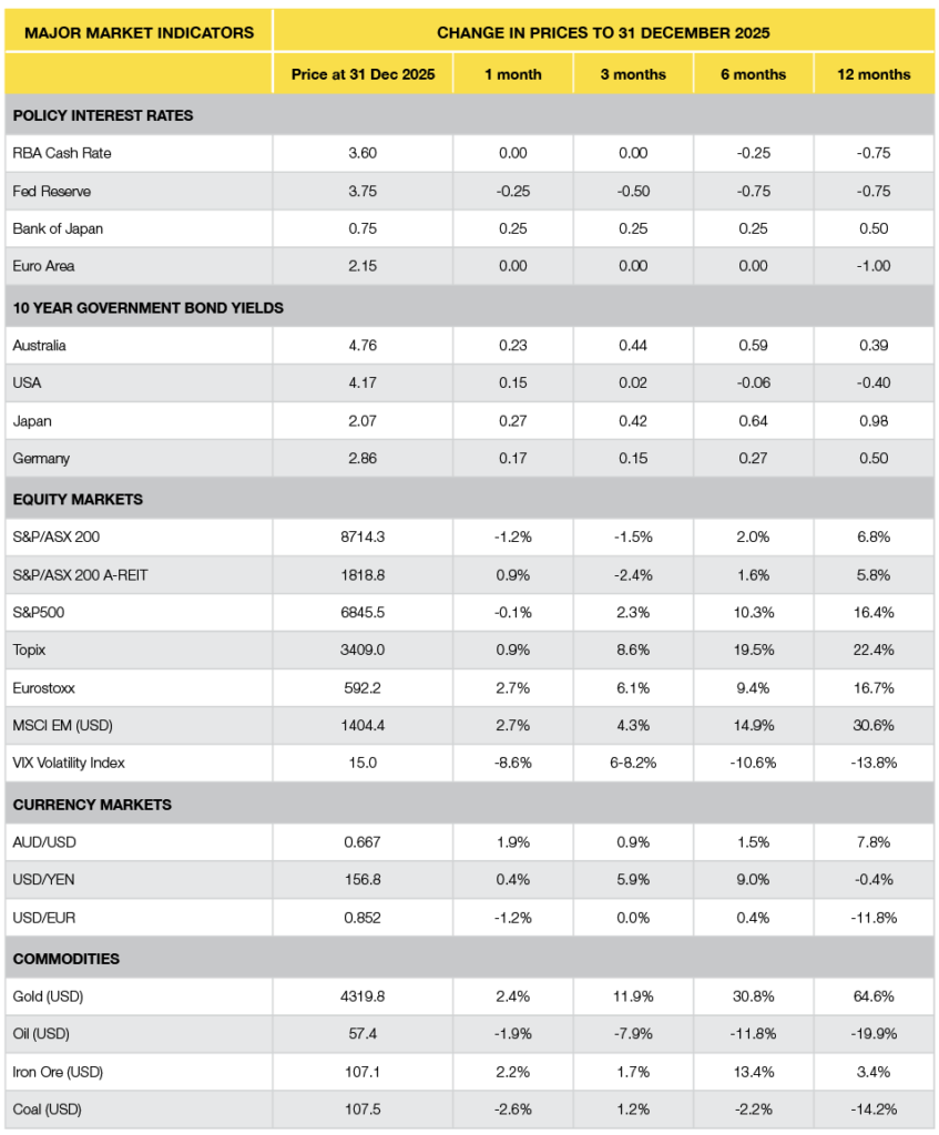 Australian sharemarkets ended the month of December up 1.3%, resulting in an underperforming 2025 return of 10.3% compared to MSCI World’s 2025 return of 12.9%.